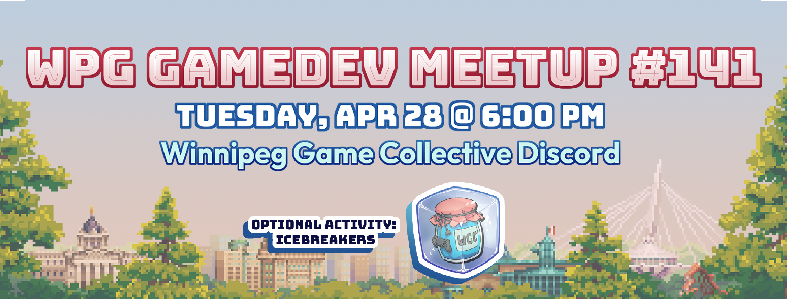 Meetup #141 is moving online! Join the Winnipeg Game Collective on Discord for a casual evening with Winnipeg's game dev community. We'll have some activities lined up to get the conversation going, with more details to be announced.